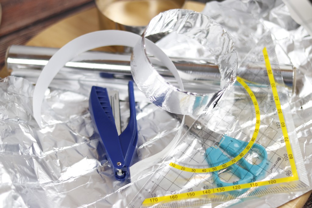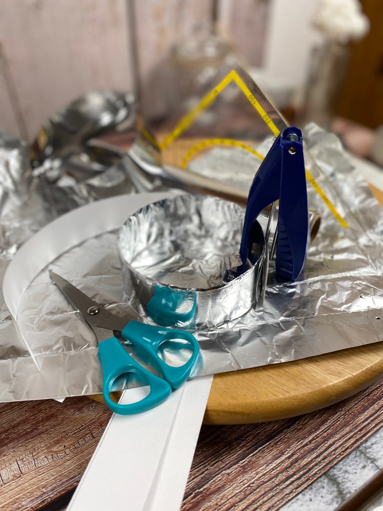 Ihr schneidet euch aus hartem Kartonpapier 3cm breite Streifen mit einer Mindestlänge von 32cm ab und umwickelt diesen mit Alufolie. Dreht euch diesen Alustreifen dann zu einem Ring mit 10cm Durchmesser und fixiert diesen mit zwei Heftklammern. Die Heftklammern umwickelt ihr anschließend auch noch mal mit Alufolie, damit diese abgedeckt sind. Da weder die Dessertringe noch die Aluringe antihaftbeschichtet sind, müsst ihr die Ringe dann innen noch mit Backpapier auskleiden. Diese Aluringe könnt ihr defnitiv mehrmals verwenden