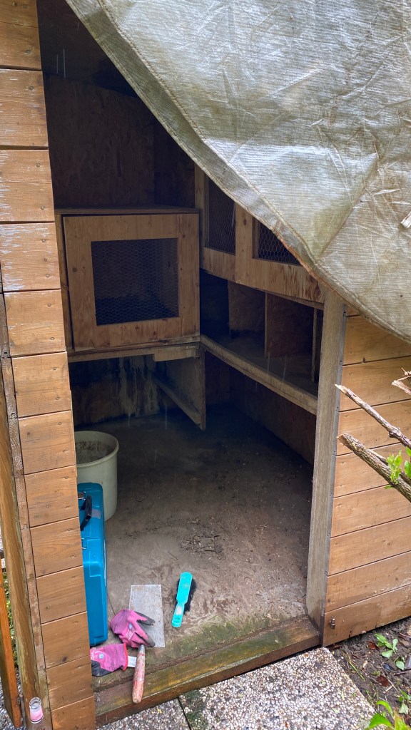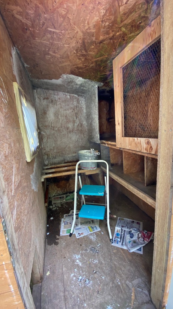 blieb vorerst aber ganz in meiner Hand. Nachdem ich irgendwann in die hintersten Winkel vorgedrungen war, feuchte Platten entfernt und die Hühnerstangen unter einem „nicht benötigen“ Hasenstall entdeckt hatte, ging es an den Innenanstrich, für den Kalkfarbe zur Milbenvermeidung empfohlen wird.