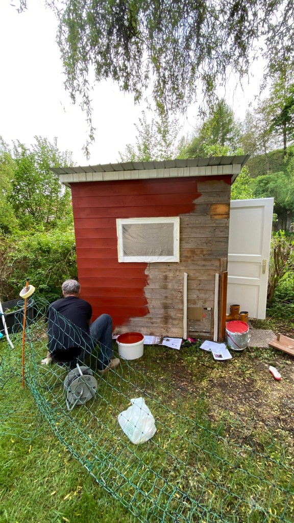 Da das Hühnerhaus im Schwedenstil erstrahlen sollte, hab ich das typische „Schwedenrot“ in Schlammfarbe bestellt, aber „weiß“ war gleich vorhanden, und ich begann die Türe zu streichen. Und siehe da: auch MrRight konnte dem Streichen etwas Meditatives abgewinnen und so werkelten wir einen ganzen Nachmittag einträchtig und friedlich nebeneinander her.