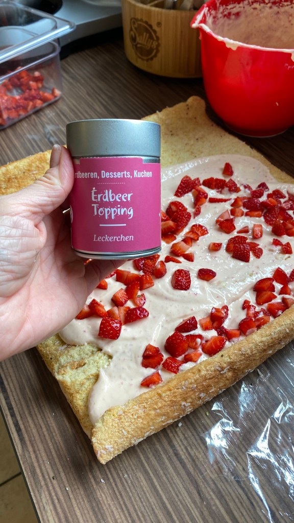 Wenn die Rolle abgekühlt ist, die Creme auf die hinteren 2/3 bestreichen (weil beim Rollen Creme nach vorne gedrückt wird), die Erdbeerwürfel gleichmäßig darauf verteilen und dann behutsam aufrollen, sodass im Endeffekt die „Rolle“ nicht nur eine „Hülle“ ist.