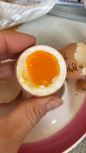 erstes Frühstücksei vom eigenen Huhn