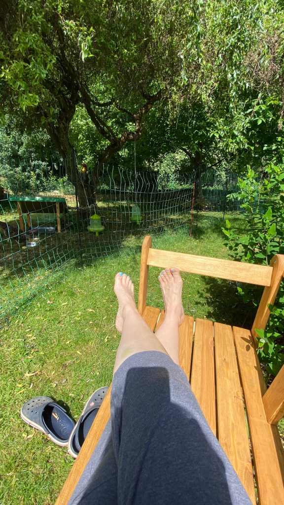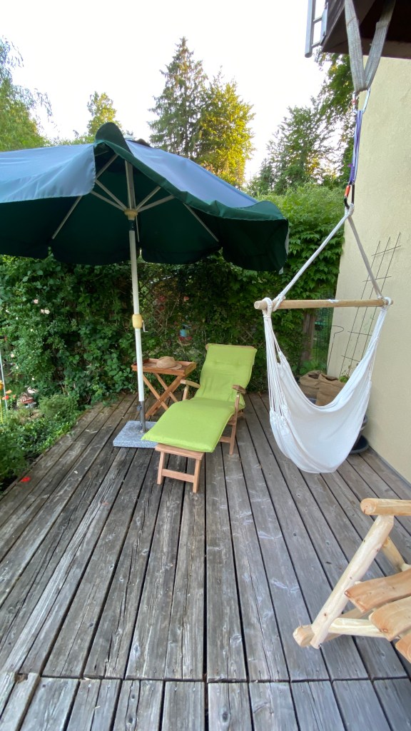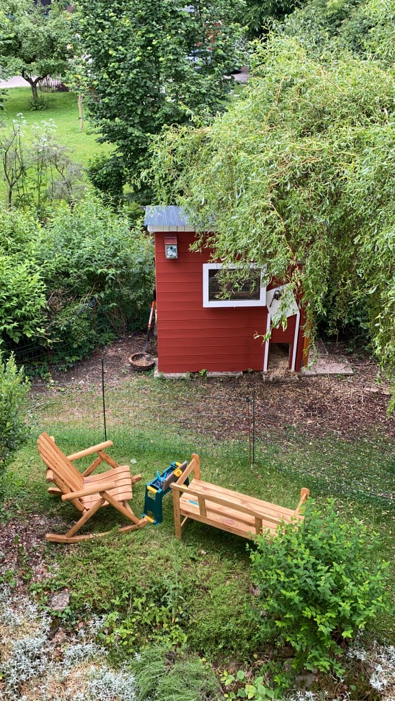 Unser Garten ist heuer mein Strand, meine Küste, mein Sonnenauf- und untergang. Durch das Hühnergehege mit der Bank und dem Schaukelstuhl davor, die beide zum Abschalten während der Geflügelbeoachtung einladen, ist unser Garten nun endlich „fertig“. 15 Jahre nachdem wir eine leere Wiese gekauft, einen Brunnen gegraben (ja und das meine ich genauso: selber gegraben!!) haben, ein Haus darauf gestellt haben und als ersten Baum einen kleinen Walnussbaum aus dem Garten meiner Oma gepflanzt haben, gehe ich jetzt endlich mit dem Gefühl durch unseren Garten, dass er jetzt endlich „mein Garten“ ist.