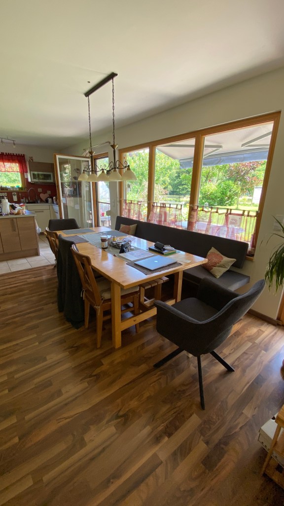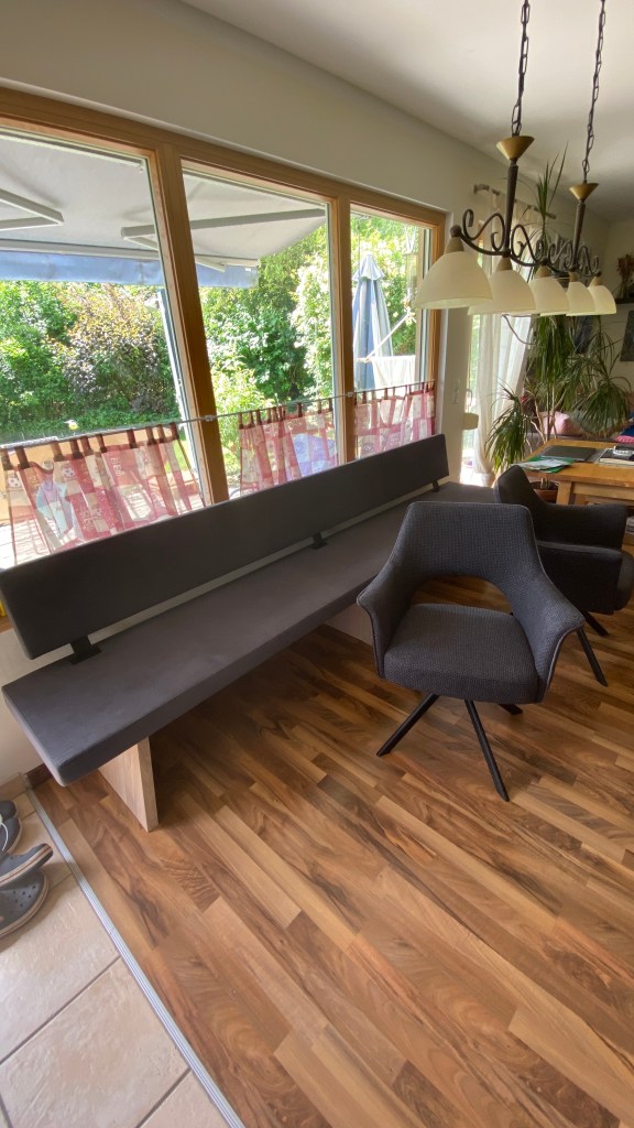 Aber um das Thema „happened“ auch happy zu beenden, darf hier und heute nicht unerwähnt bleiben, dass Ende Juni tatsächlich wie vom Möbelhaus versprochen, pünktlich unsere neue Sitzgruppe für unseren großen Esstisch geliefert wurde. Seit ich unser Haus und die Raumaufteilung geplant hatte (und JA, es ist ein Fertighaus und JA, ich hab denen gesagt, wie es aussehen soll 😉) hab ich davon geträumt an unserem 3-Meter-Tisch gemütlich zu sitzen, was nun endlich, endlich, endlich in Erfüllung gegangen ist. (Ich bedanke mich an dieser Stelle bei Cordula, die unsere Reiselust abgebremst hat, und bei meinem ignoranten, ehemaligen Arbeitgeber, der sich meinen unfreiwilligen Abgang eine Stange Geld kosten hat lassen)