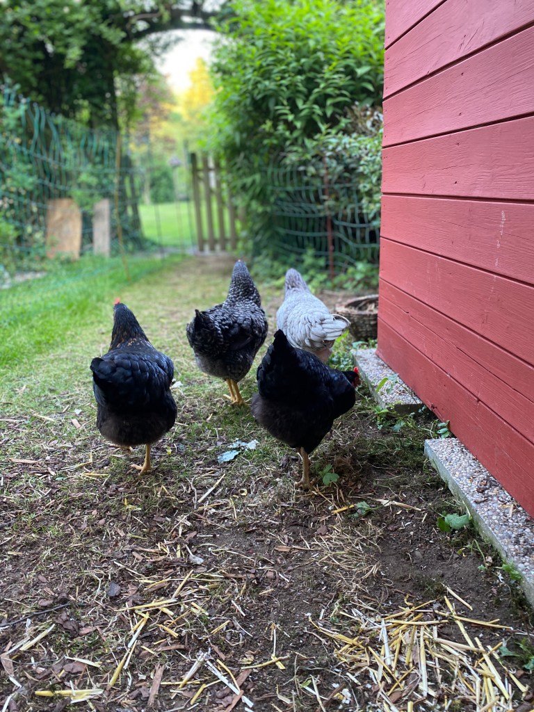 Und sonst? Der Frieden unter allen Fünf könnte besser sein, aber Flora ist mutiger geworden und frisst uns auch bereits aus der Hand. Alle fünf sind aufgeweckte zutraulicher Hühner, die mittlerweile Kapuzinerkresse als Droge erkannt haben. Sie lieben es, wenn ich einmal am Tag mit einer Gemüse-Obst-und Körner-Mischung komme, laufen mir entgegen und machen mich glücklich.