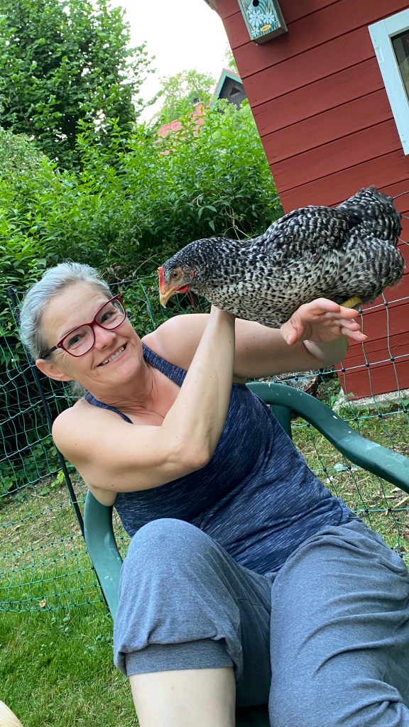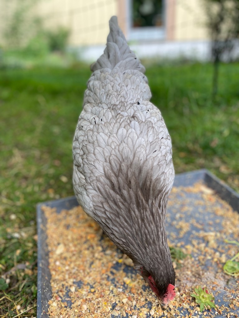 Seine Hühner sahen alle richtig schön aus, und auf einmal wollte sich MrRight seine eigene Henne aussuchen. Er hat sich für eine tatsächlich richtig schöne, grau schimmernde Königsberger Henne, und ich mich für ein deutsches Sperberhuhn entschieden. Entgegen meinem Vorhaben sie „Hanni und Nanni“ zu nennen, wählte er für seine Henne „Jutta“ als Namen. Warum auch immer 🤣 Also grübelte ich kurz, und nannte mein Huhn dann „Daisy“
