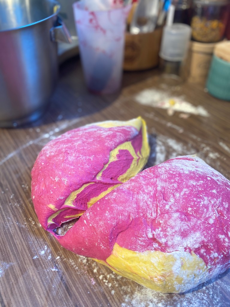 SCHRITT 3a: Beide Teige auf eine bemehlte Arbeitsfläche stürzen und sanft ineinander „verkneten“. Nicht zu viel – nur so viel, dass sie aneinander haften. Danach ebenfalls vier Teile abstechen, sanft falten, länglich wirken und mit Abstand in eine gefettete Form setzen. Abdecken und ca. 90 Minuten gehen lassen. Backrohr rechtzeitig auf 180°C O/U vorheizen.