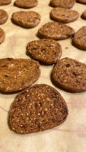 Nach der Kühlphase den Backofen auf 190° O/U vorheizen. Von jedem Strang ca. 40 Scheiben abschneiden und mit genügend Abstand auf das ungefettete Blech setzen. (laufen etwas auseinander) Auf mittlerer Schiene ca. 10-12 Minuten knusprig backen.