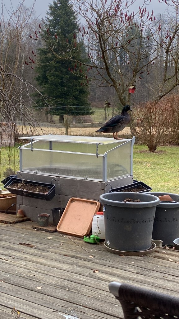 Am 26. März war Berti dann plötzlich schon am frühen Vormittag weg. Den ganzen Tag hielt ich Ausschau, aber er war nicht mehr zu sehen. Diesmal dachte ich wirklich, dass er endgültig weg war. Als ich MrRight am Abend ganz unruhig und auch traurig von Bertis endgültigem Verschwinden berichtete, hörten wir plötzlich ein dumpfes Geräusch an der Hauswand. Und als wir nachsahen, watschelte er unversehrt rund ums Haus auf die Terrasse 🤣 Glücklich, dass er heimgekehrt war, hatten wir sofort Disneys Quack, den Bruchpiloten, oder auch den Albatros „Orwell“ von Bernhard&Bianca im Kopf.