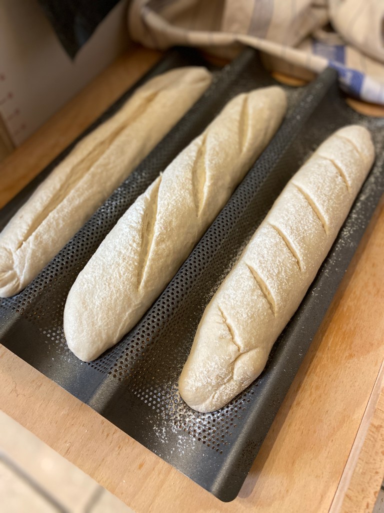 Nach der Gehzeit die Teiglinge sanft auf ein Baguetteblech (oder ein normales Backblech) legen, leicht bemehlen und mit einer Bäckermesser rasch tiefe schräge Schnitte setzen. (In meinem Store findet ihr dafür auch den Baguette-Einsatz!)