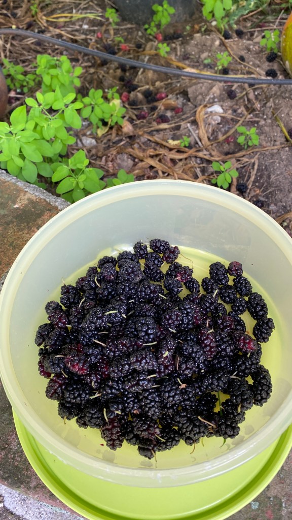 Am besten schmecken die Maulbeeren kurz bevor sie abfallen, dh kurz bevor sie dunkelblau sind, weswegen „pflücken“ besser ist als sie vom Boden aufzusammeln. Mit ruhiger Hand und viel Geduld sammelt man dann jede einzelne Frucht ab ohne die Äste zu berühren. (im Grunde so wie bei diesem Geduldsspiel, wo man mit einem Drahtkolben „Metallwege“ abfährt und es dann sofort laut hupt, wenn man das Metall berührt 🤣) Und natürlich hängen die schönsten Früchte gaaaaanz oben, was mich dann dazu anspornt mittels Leiter weiter hoch zu klettern 😉