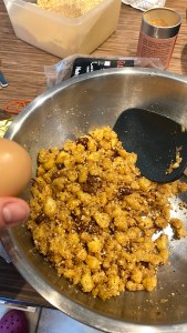 Die gerösteten Semmelbrösel, Mandeln, Zitronenschale und die Rosinen unter die Apfelmasse rühren, leicht abkühlen lassen und anschließend mit einem Ei gut verrühren.