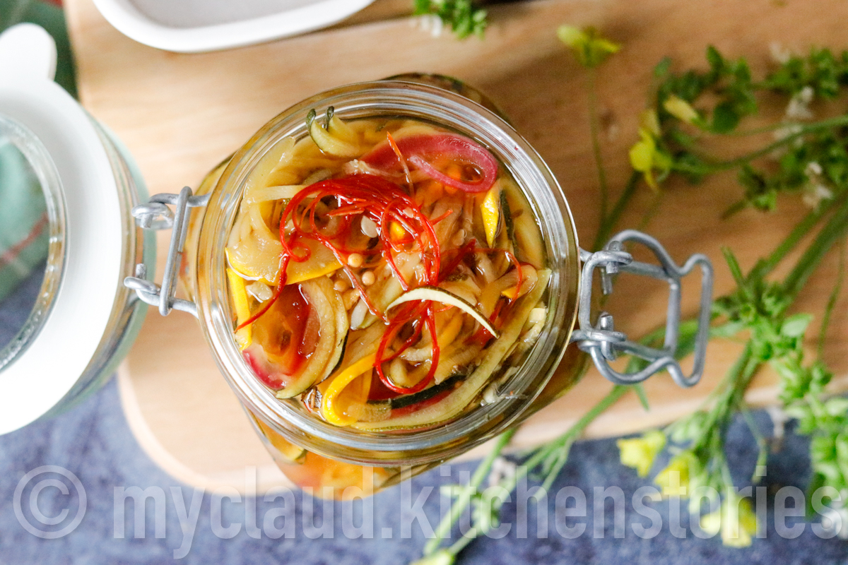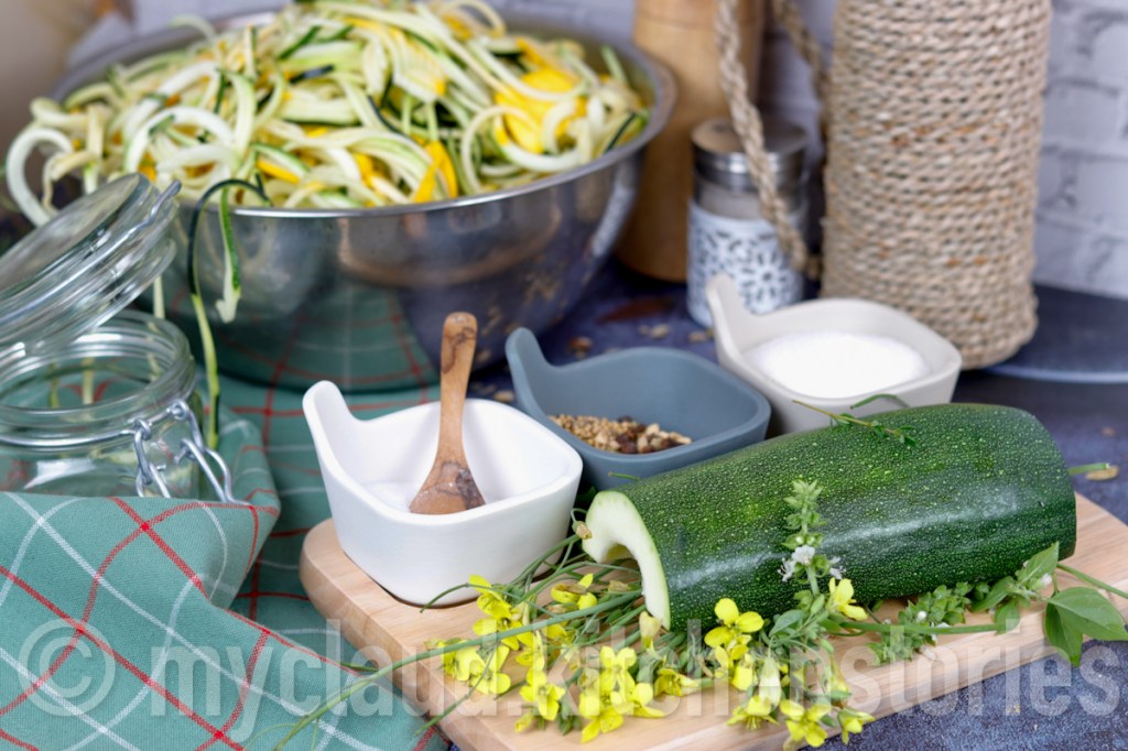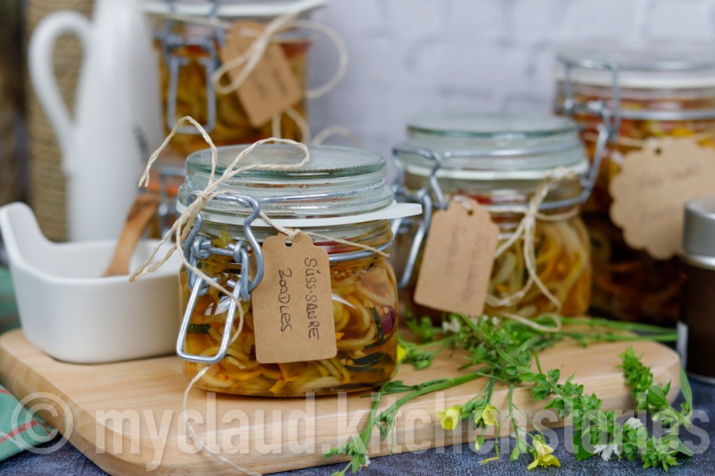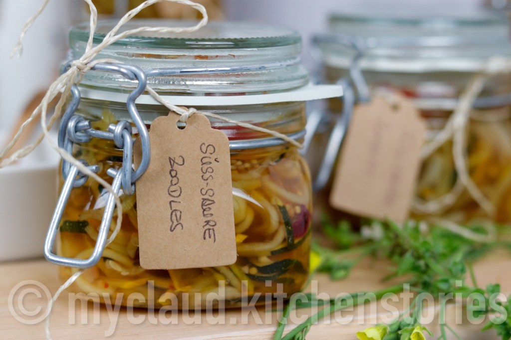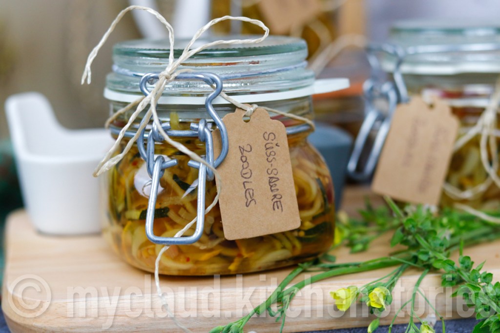 Ich bin ja im Grunde nicht so der „Einkochtyp“, da ich selbst im Tiefkühler vergesse, was drinnen ist. Ich bin mehr so der „aus dem Auge, aus dem Sinn“-Typ, aber diese eingelegten Zucchini, die ich als „Spaghetti-Zucchini“ (=Zoodles) mit einem Spiralschneider spiralisiert habe, die lassen sich auch wunderbar verschenken #dasnächsteweihnachtenkommtbestimmt