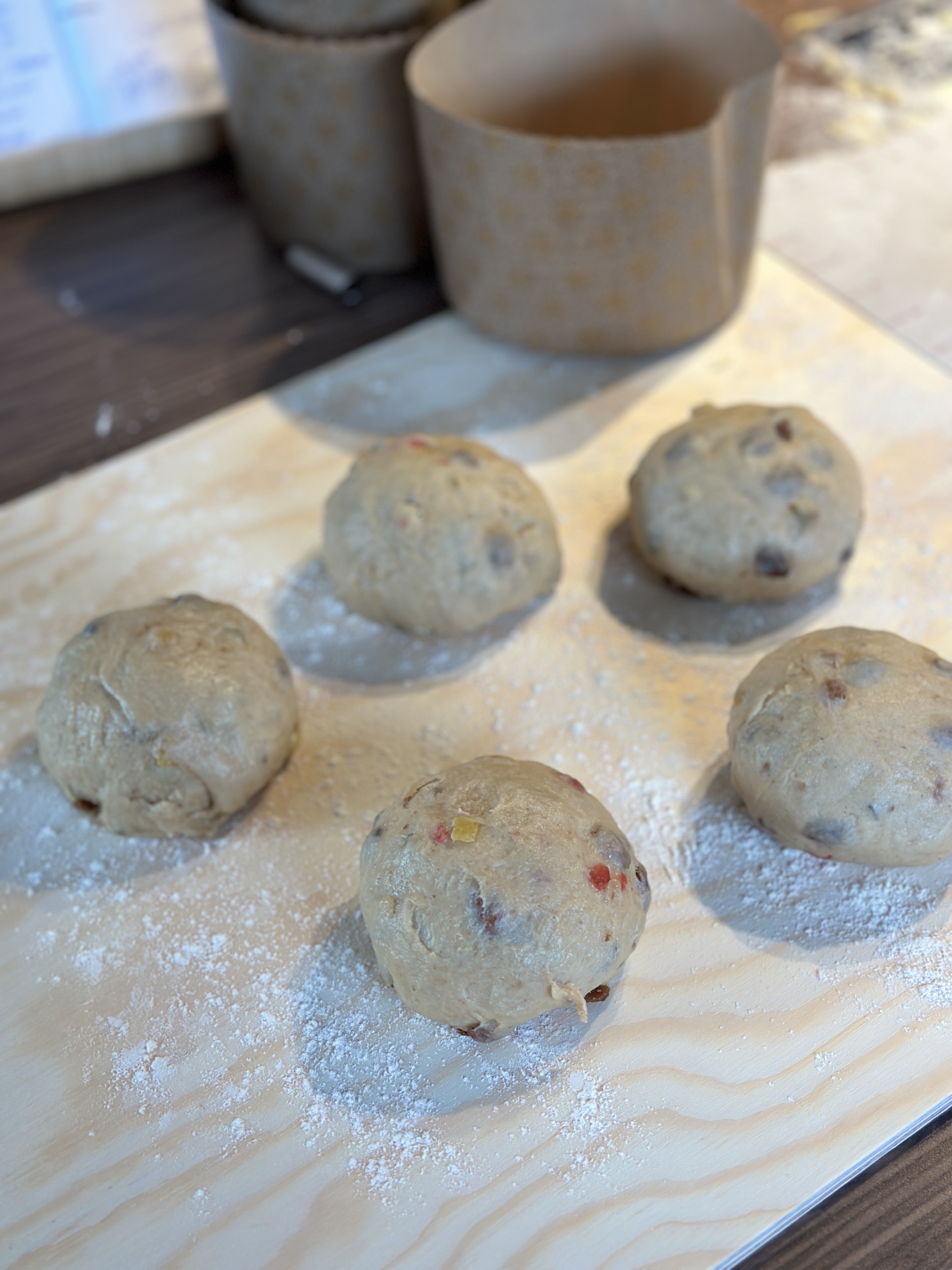 Nachdem sich der Teig verdoppelt hat, den Teig in 5 Stücke zu je 250g teilen, diese rund schleifen und mit Schluss nach unten NICHT abgedeckt ca. 1 Stunde entspannen lassen.