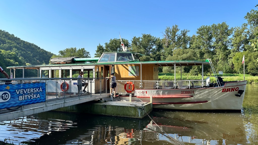 Das Tollste aber war, dass einige Meter vom Badeplatz bzw. Campingplatz entfernt ein sogenannter „Dampfer“ die Menschen nach Brünn transportierte. Als ich das las, wusste ich sofort, dass ich das machen will. Eine Stunde lang fuhr das Schiff/Boot/Kahn, der Dampfer 😉 die extrem begrünte Svratka entlang, sodass in mir ein wenig Mississippi-Feeling aufkam. Ich geb aber zu, dass ich über eine sehr rege Phantasie verfüge und sehr leicht zu begeistern bin. Soweit ich das beurteilen kann, ist dies eine Art öffentliches Verkehrsmittel, das alle 45 Minuten in beide Richtungen fährt, man ist also auch zeitlich nicht sehr gebunden. Die Fahrt „Hin und Retour“ hat mit dem Fahrrad pro Person 10€ gekostet, was wir als echtes Geschenk empfanden.