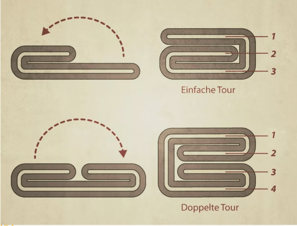 Bei der doppelten Tour wird zuerst der Teig oben und unten zur Mitte hingefalten, und dann als Ganzes gleich noch mal.