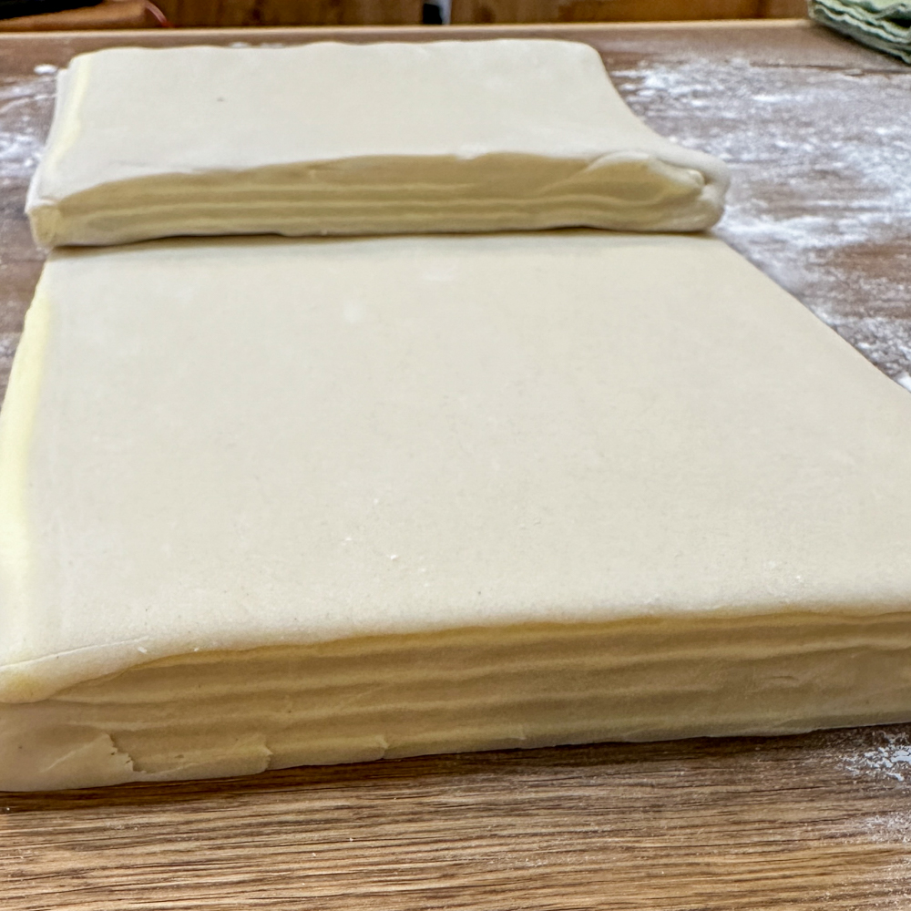 Nach jeder Tour wird das Teigpaket um 90°C auf der Arbeitsfläche gedreht, die eingeklappten Teigseiten werden links und rechts eingeschnitten, da sich der Teig ansonsten beim Ausrollen aufgrund von zu viel Spannung verschieben würde. (Hält man die Temperatur im Blick, tritt hier dann keine Butter aus. Sollte diese Gefahr drohen, lieber das Teigpaket gut in Frischhaltefolie einpacken und für eine halbe Stunde kühlen.) Ist temperaturtechnisch alles im kühlen Bereich wird nun längs weiter ausgerollt - also GEGEN die Faltrichtung!