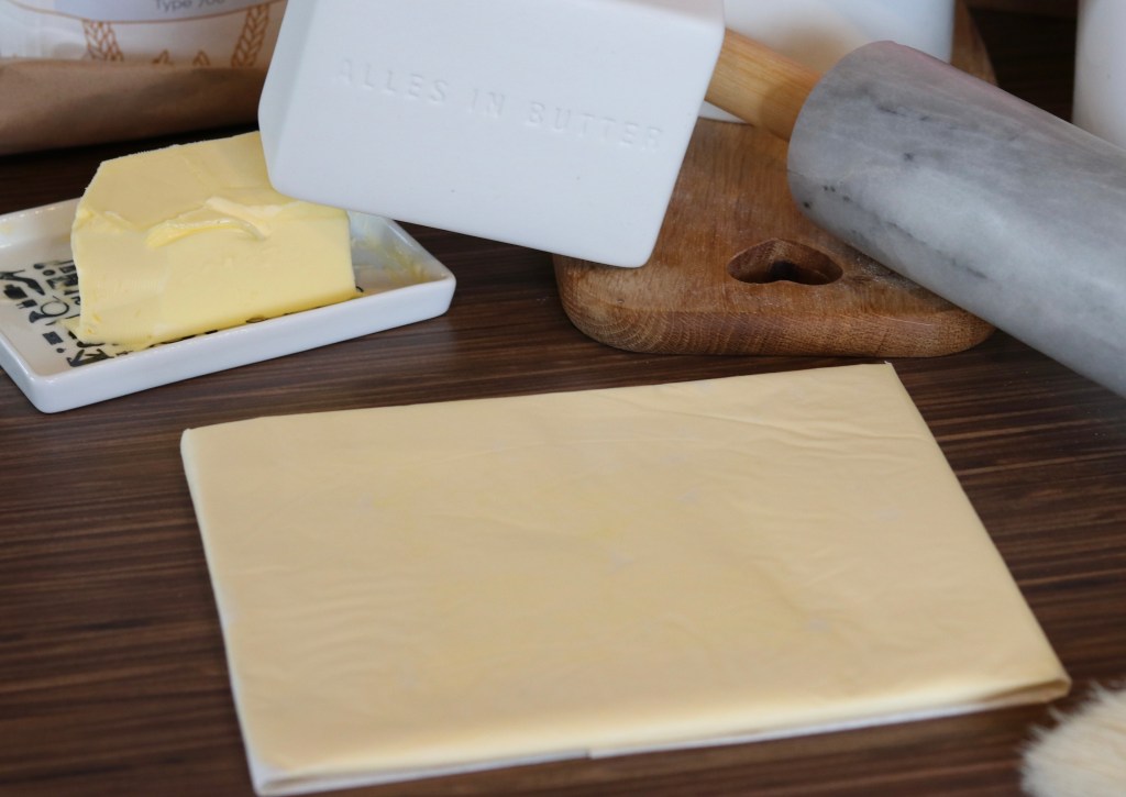 Ihr tut euch um einiges leichter, wenn ihr euch die Butterplatte mit Backpapier gleich in der passenden Größe vorbereitet. Ein 250g-Stück Butter ausrollen und dann in den Teig einarbeiten, das kann ich euch jetzt schon sagen, wird bei wenig Erfahrung nicht zum Erfolg führen.