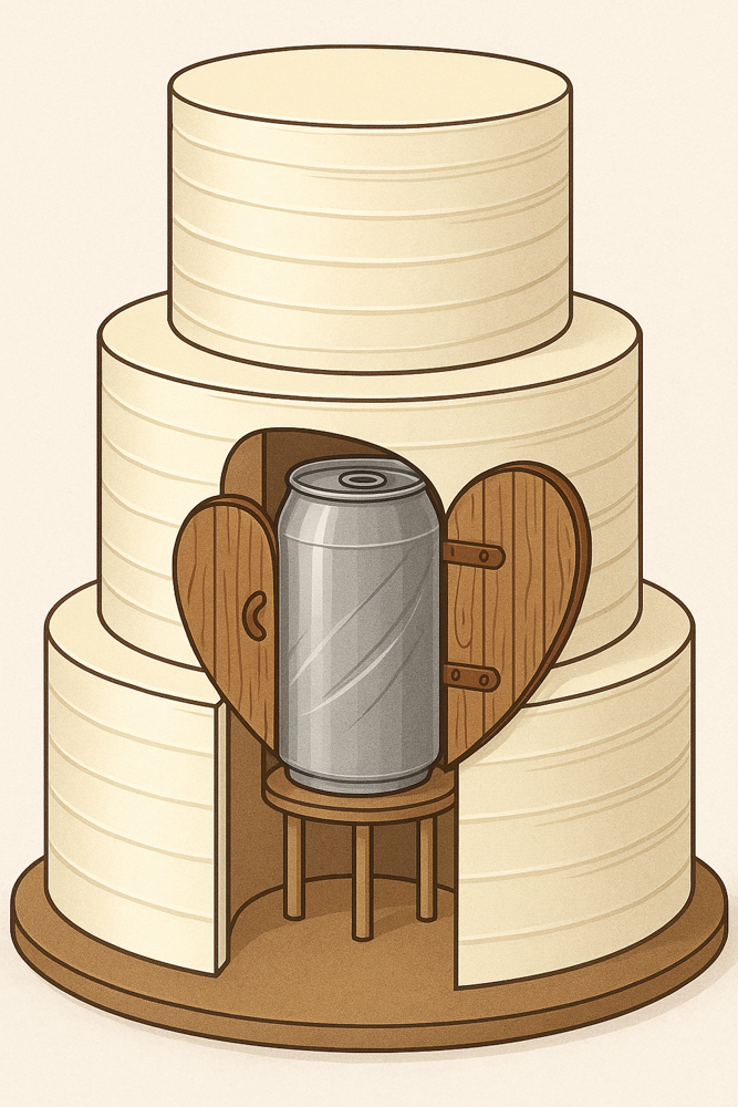 Dennoch darf man bei Hochzeitstorten die Stabilität nie außer Acht lassen. Jedes Stockwerk hat mindestens 15cm in der Höhe, und mit Füllungen und Böden kommt da eine ganze Menge an Gewicht zusammen. Hatte ich doch außerdem noch die „blöde Idee“ geboren, eine Dose Bier (für die beiden Bier-Feinschmecker) in der Torte zu verstecken. Diese Ideen kommen mir übrigens immer relativ spontan und kurzfristig – heißt, am Montag vor der Hochzeit.