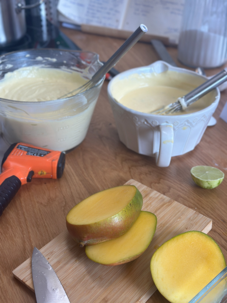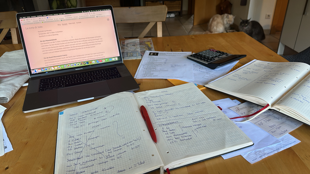 Der Montag ist meist mein „Inventurtag“: Wie möchte ich meine Torten nun tatsächlich füllen, was hat Saison? Rezepte raussuche, ausdrucken, Einkaufsliste schreiben, Zutaten und Zubehör checken, und Listen über Listen schreiben, sodass der komplette Ablauf einen Plan hat.