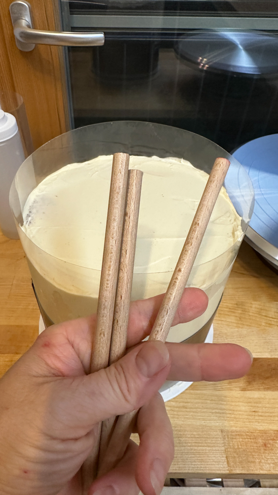 Zum Stabiliseren hab ich Buchenholzstäbe abgesäbelt. Ja, die sollten GENAU die Höhe der jeweiligen Etage haben, sonst wackelt die nächste Etagentorte. Und genau das ist mir bei der oberen Torte dann passiert. Vor Ort wollte ich die obere Torte aufsetzen, und es hat tatsächlich um ein paar Millimeter nicht gestimmt. Da war wohl „jemand“ schlampig beim Messen ;). Ich hab dann versucht, das Dilemma mit Buttercreme auszugleichen. Perfekt war das nicht, aber es kommt auf die Liste „Do not!“ für die nächste Hochzeit. Und lieber zu niedrig, als zu hoch, das weiß ich jetzt auch!