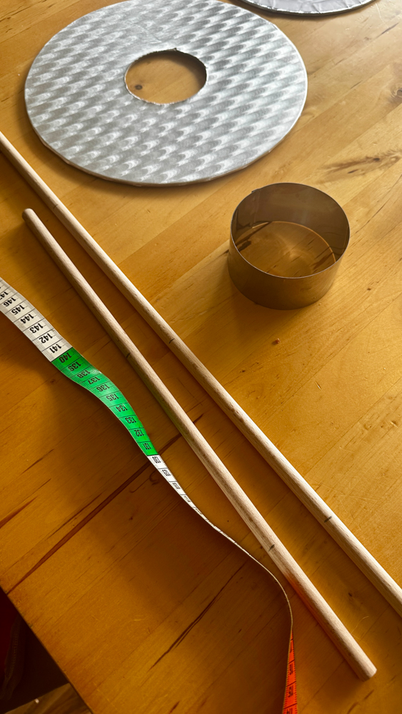 Unter jede Tortenetage kommt eine Cakecard. Diese ist ca. 2mm dick, im Durchmesser immer kleiner als die Torte selber und von außen somit unsichtbar. Darunter sitzen dann die richtig abgeschnittenen Stabiliserungstäbe, dh die Torte sitzt dann mit ihrer Cakecard auf den Stäben, und das Gewicht der jeweiligen Etage drückt nicht auf die unteren Etagen. Macht Sinn, oder? Manche verwenden zum Stabilisieren Plastikstrohhalme, ich setze auf Holz, das hält auf jeden Fall und ist gerade in Verbindung mit Lebensmittel absolut unbedenklich. Man denke nur an das klassische Schneidebrett.