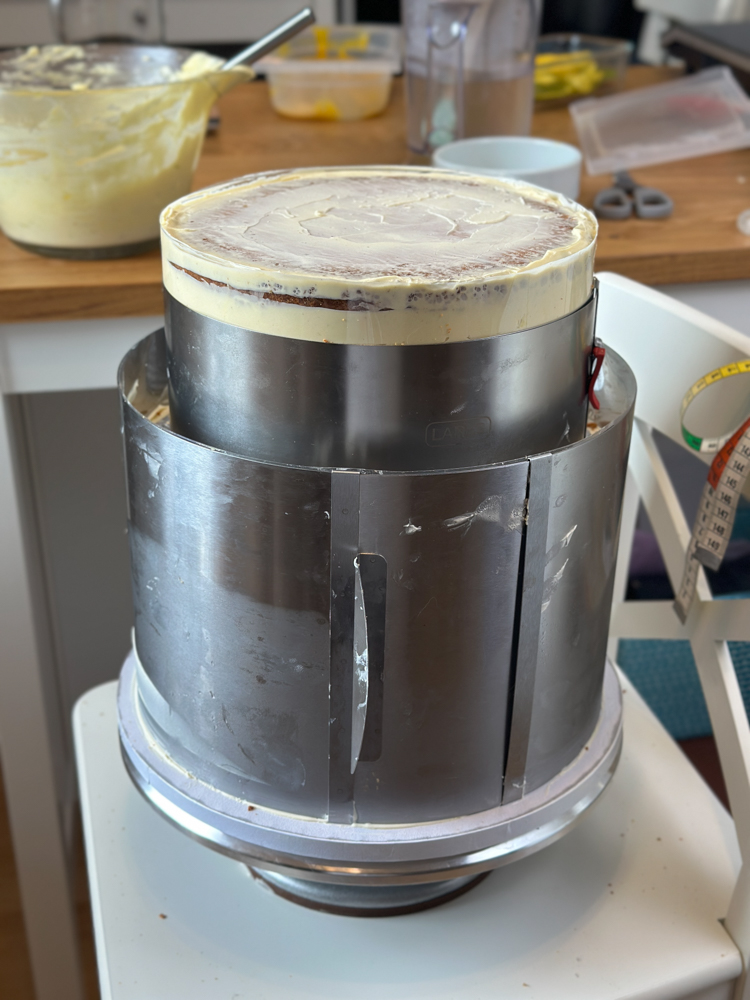 Mit Behälter und Dose kam dieses Inlet auf stolze 800 Gramm. Und mit einer Höhe von 22 cm war auch klar, dass es in die mittlere Torte ragen würde, was meine Gehirnzellen stark in Anspruch nahm, baut man normalerweise nämlich (also ich mach das so, weil ich keine professionelle Tortenanlieferin bin ;)) vor Ort auf. Dh man transportiert die Torten einzeln und stapelt sie erst auf der Hochzeitslocation. Das ging diesmal also nicht. Die untere und die mittlere Torte mussten direkt aufeinander gestapelt und stabilisert werden. In welche Reihenfolge streiche ich ein? Wie lange muss die Untere kühlen, bis ich mit der Mittleren weitermachen kann? Bring ich diese Höhe überhaupt in den Kühlschrank?