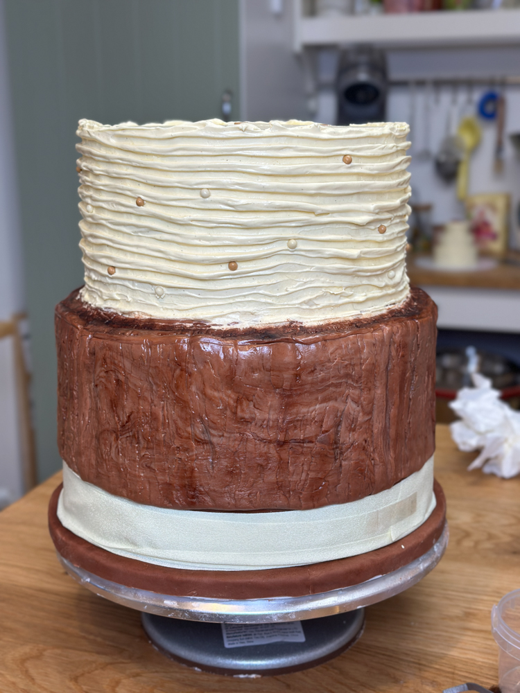 Eingestrichen mit russischen Buttercreme sollten die untere und die obere Torte ein „Baumstamm-Desgin“ aus Fondant bekommen. Ich liebe es mittlerweile mit Fondant zu arbeiten. Die mittlere Torte hatte ich im Streifendesign mit Buttercreme gestaltet. Davor hatte ich mir noch haufenweise TikTok-Videos angesehen, wie man das macht, und da es an dem Tag vor der Hochzeit dann doch schon wieder sehr warm war, war das echt ein Unterfangen. Was habe ich daraus gelernt: die nächste Hochzeitstorte – und die kommt ja bereits Mitte August – wird komplett mit Fondant eingedeckt, da das noch am hitzeunempfindlicheren ist 😉