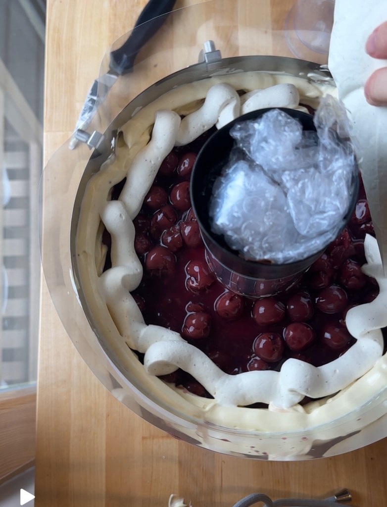 Cremefüllungen und diesmal Sauerkirschfüllung, und natürlich die Buttercreme zubereiten (hab ich in Summe dreimal gemacht, bis ich genug hatte) und dann natürlich zu stapeln und zu schichten beginnen, und dazwischen immer wieder kühlen. Und dafür natürlich im Kühlschrank Platz schaffen! Ich hab Gott sei Dank meinen eigenen Kühlschrank 😉